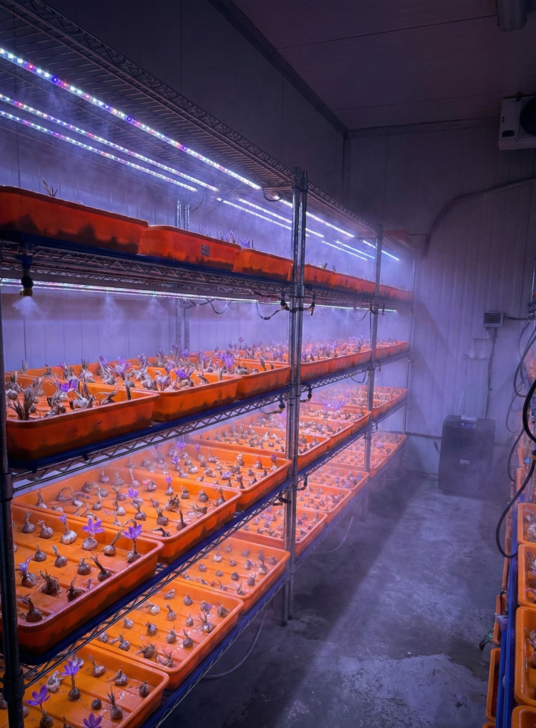 We cultivate saffron in a modern indoor facility using controlled, soil-free systems, with personal involvement at every stage—from bulb selection to harvest.